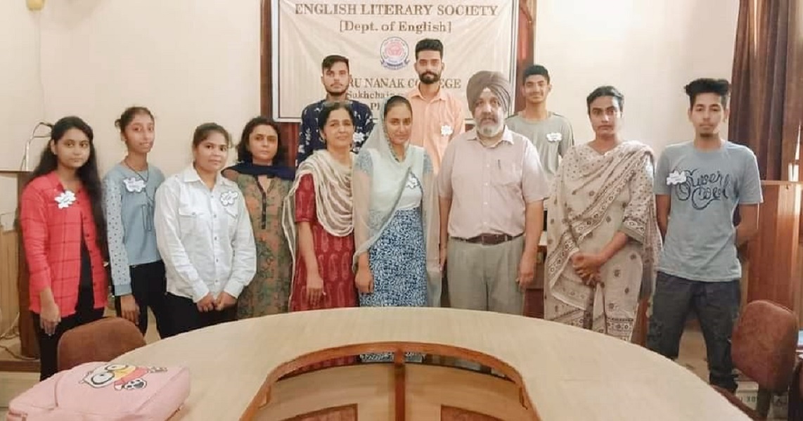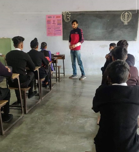 Mohit Chumber of B.A. Sem III giving a lecture on “Use of Active and Passive Voice” on his visit to Shri Hargobind Senior Secondary School, Palahi on Dec 10, 2021