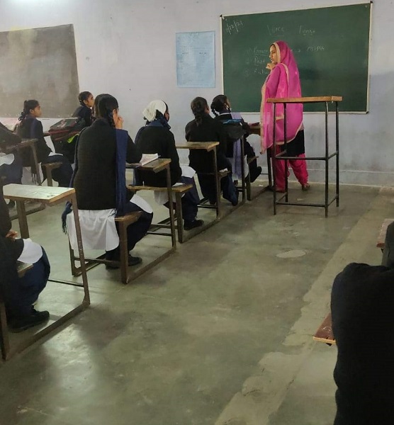 Jasvir Kaur of B.A. Sem III addressing the learners of Shri Hargobind Senior Secondary School, Palahi on 10-12-2021