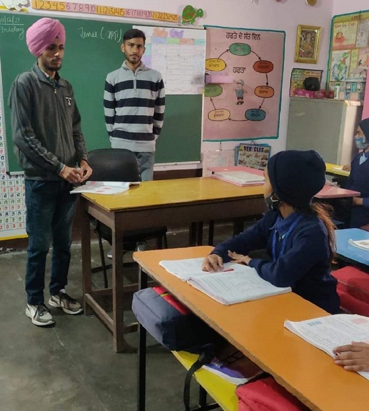 Under Community Development Programme, Gurvinder and Arun of B.Com. (F.S.) Sem V detailing nuances of Tenses and their uses to the students of Gounspur village school on 10.12.2021